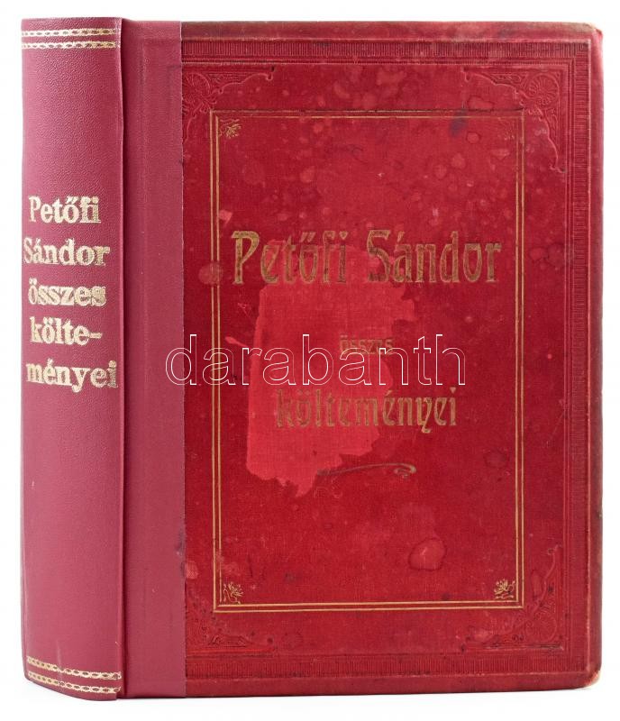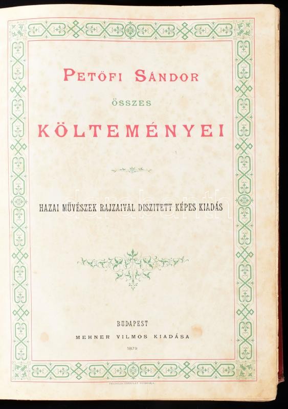 Petőfi Sándor összes költeményei. Hazai művészek rajzaival díszített képes kiadás. Bp., 1879. Mehner Vilmos,(Franklin-ny.), 805+9 p. Gazdag szövegközti képanyaggal illusztrált. Kiadói aranyozott egészvászon-kötés, aranyozott lapélekkel, javított, pótolt gerinccel, javított kötéssel, foltos borítóval, foltos, kissé sérült lapokkal.