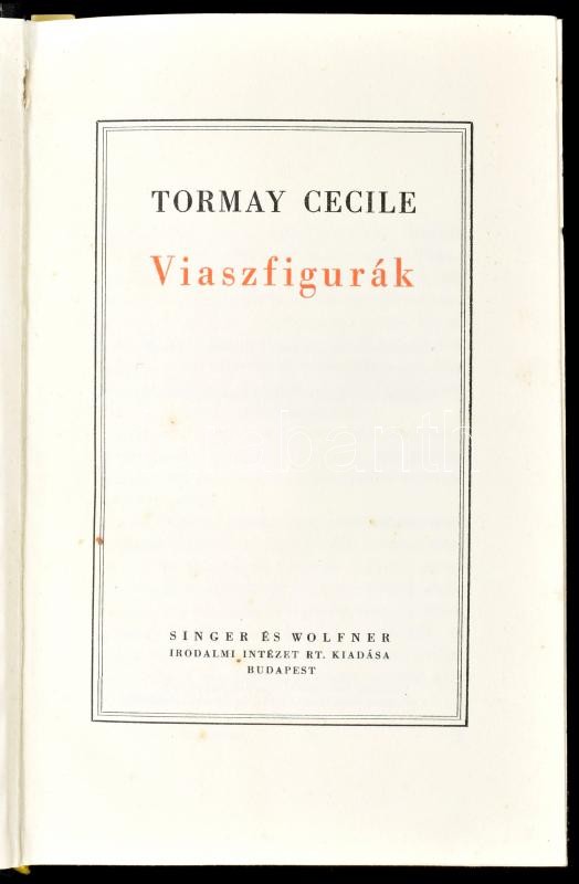 Tormay Cecile: Viaszfigurák; Görög mesék. (Egy kötetben). Tormay Cecile művei III. köt. Bp., 1939, Singer és Wolfner, 297+(1) p. Aranyozott félvászon-kötés, kissé sérült, kopott borÃtóval, helyenként kissé foltos lapokkal.