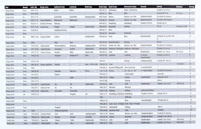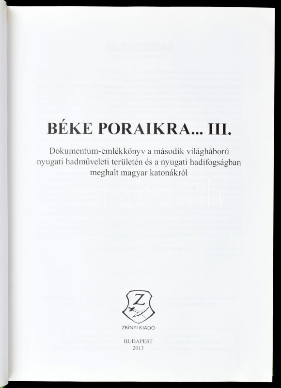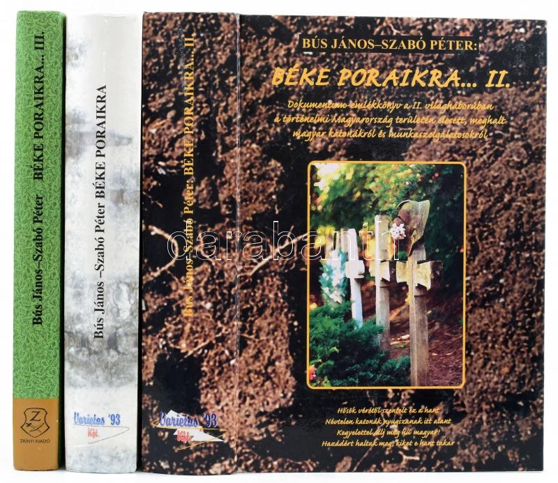Bús János-Szabó Péter: Béke poraikra... I.,II.,III. kötet, Dokumentum-emlékkönyv a II. világháborúban a keleti hadműveletek során /a történelmi Magyarország területén/ nyugati hadműveleti területén elesett és nyugati hadifogságban meghalt magyar katonákról és munkaszolgálatosokról, Bp., 1999 Varietas 93 Kft., Bp., 2001 Varietas 93 Kft., Bp., 2013, Zrínyi Kiadó, Kiadói kartonált papírkötésben, jó állapotban