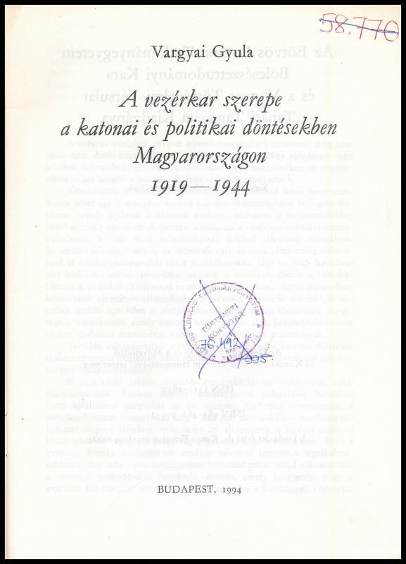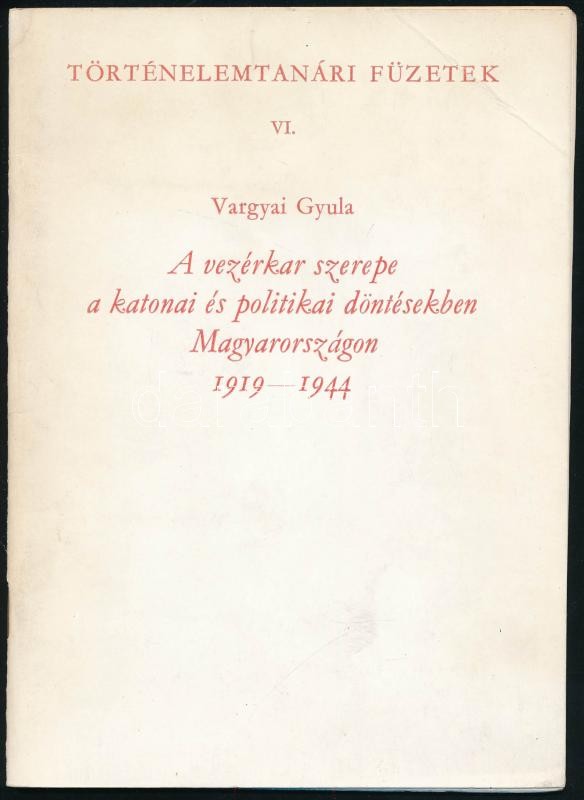 Vargyai Gyula: A vezérkar szerepe a katonai és politikai döntésekben Magyarországon 1919-1944, Történelemtanári Füzetek VI. Bp., 1944, az Eötvös Loránd Tudományegyetem Bölcsészettudományi Kara és a Magyar Történelmi Társulat Tanári Tagozata kiadványa, kiadói papírkötésben