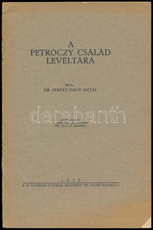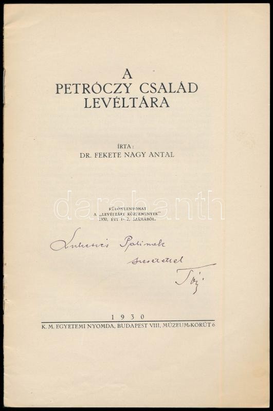 Fekete Nagy Antal: A Petróczy család levéltára. A szerző, Fekete Nagy Antal (1900-1969) történész, levéltáros által Lukcsics Pál (1892-1936) levéltáros részére DEDIKÁLT példány. Különlenyomat. Bp., 1930., Kir. M. Egyetemi Nyomda, 13 p. Különlenyomat. Kiadói papírkötés, szakadt borítóval.