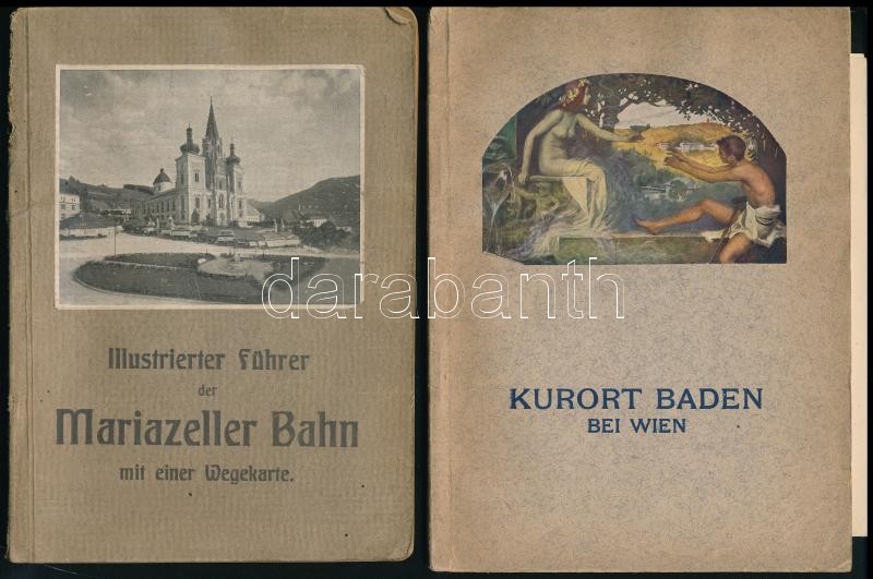 3 db osztrák útikönyv: Kurort Baden bei Wien; Illustrierter Führer der Mariazeller Bahn; Wien und Niederösterreich. Fekete-fehér képekkel illusztrálva. Német nyelven. Kiadói papírkötés, kissé sérült állapotban.