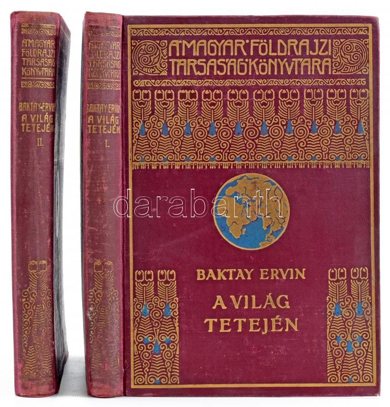 Baktay Ervin (1890-1963): A világ tetején I-II. kötet. Kőrösi Csoma Sándor nyomdokain Nyugati Tibetbe. Magyar Földrajzi Társaság Könyvtára. Bp., é. n.[cca 1930 után], Lampel R. (Wodianer F. és Fiai), 1 (címkép) t. +1-144 p.+17 (fekete-fehér fotók) t.+145-312 p.+13 t.(fekete-fehér fotók.)+2 t. (térképek.) Harmadik kiadás. Kiadói dúsan aranyozott egészvászon sorozatkötésben, a borítón kopásnyomokkal.
