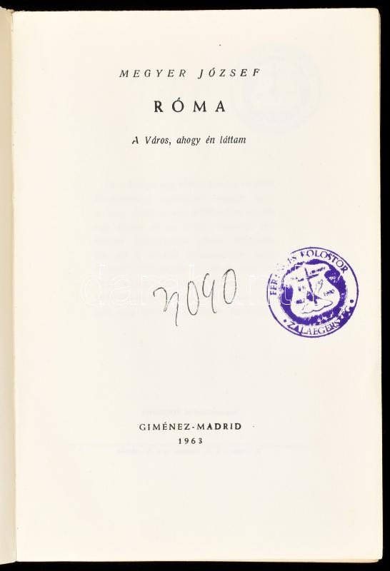 Megyer József: Róma. A Város, ahogy én láttam. Madrid, 1963, E. Giménez, 491 p. Első kiadás. Kiadói papírkötés, sérült borítóval, ajándékozási bejegyzéssel, bélyegzőkkel.