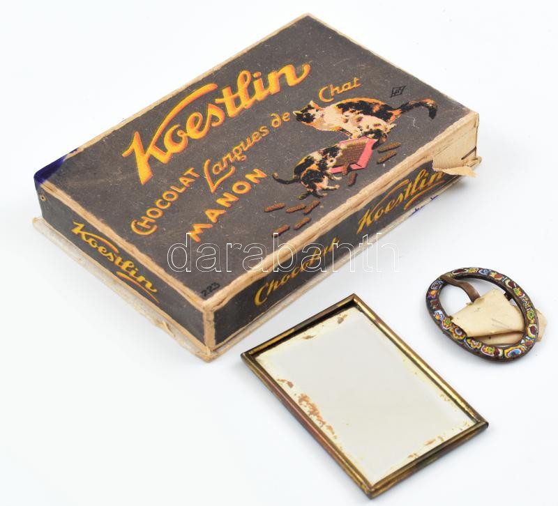 Koestlin macskanyelv csokoládés kartondoboz, benne régi fazettált zsebtükör és tűzzománc díszítésű övcsat. Koruknak megfelelő állapotban, doboz mérete: 12x8 cm