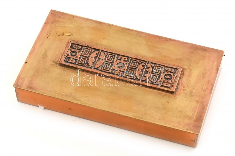 Leírás: Retró iparművészeti réz doboz, benne vegyes öngyújtókkal. Kopásnyomokkal, 18x10 cm