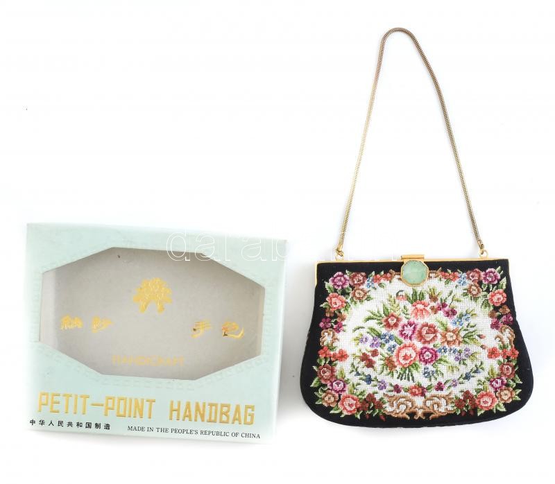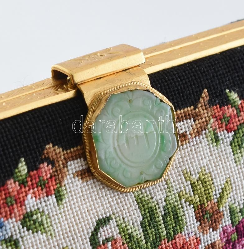 Leírás: Színházi tűgobelin táska, jáde köves záródással, eredeti dobozában, jó állapotban, 13×17 cm