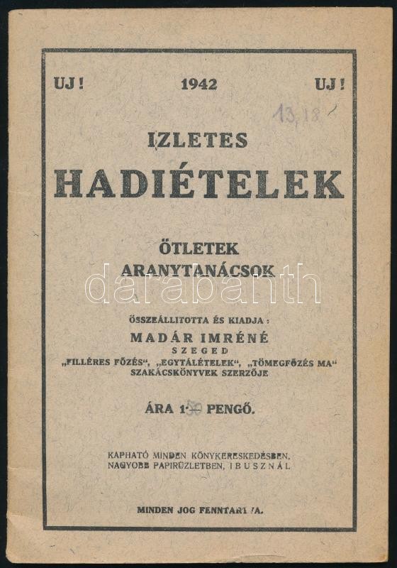 1942 Ízletes hadiételek. Ötletek, aranytanácsok. Összeállította és kia... https://www.darabanth.com/hu/419-Gyorsarveres/419.0/Mutargy-papirregiseg-egyeb/Militaria~500030/1942-Izletes-hadietelek-Otletek-aranytanacsok-Osszeallitotta-es-kiadja-Madar-Imrene-~II2650924