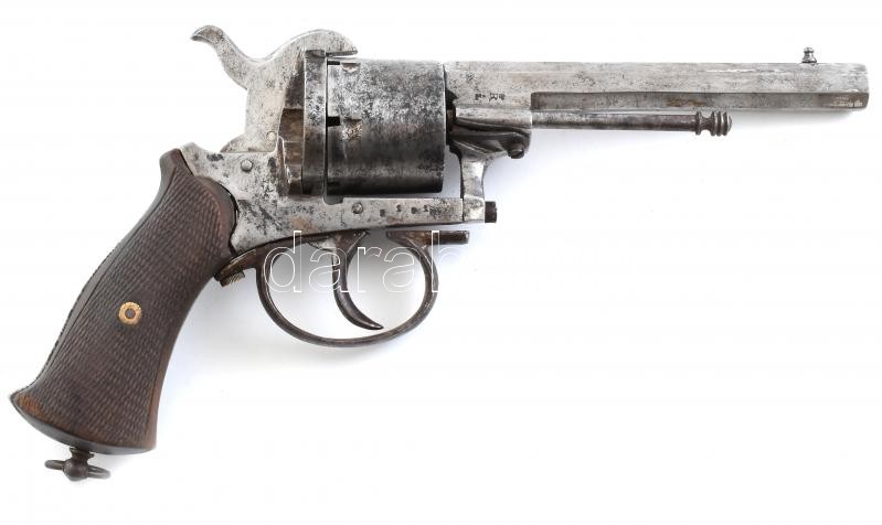 Leírás: Régi forgó pisztoly, revolver, 19. század vége, jelzett: Manufacture d'armes RONGE Jean-Baptiste, 9-es kaliber, kopott, 25cm (hatástalanított)