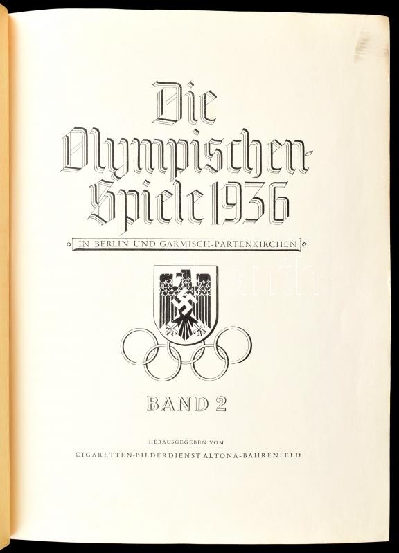1936 Olympia 1936. Die XI. Olympischen Spiele in Berlin und Garmisch-Partenkirchen. Band I-II. Band I. Die Olympischen Winterspiele Vorschau auf Berlin. Band II. Die XI. Olympischen Spiele in Berlin 1936. Herausgegeben vom Cigaretten-Bilderdienst. Altona (Hamburg)-Bahrenfeld, 1936, Cigaretten-Bilderdienst, 127+1 p.+5 (fekete-fehér képtáblák.) t. t.+1 (kihajtható térkép) t.; 165+3 p.+8 (fekete-fehér képtáblák.) t. Cigarettakép gyűjtő albumok, az összes gyűjtőképpel, német nyelven. Kiadói aranyozott egészvászon-kötés, jó állapotban