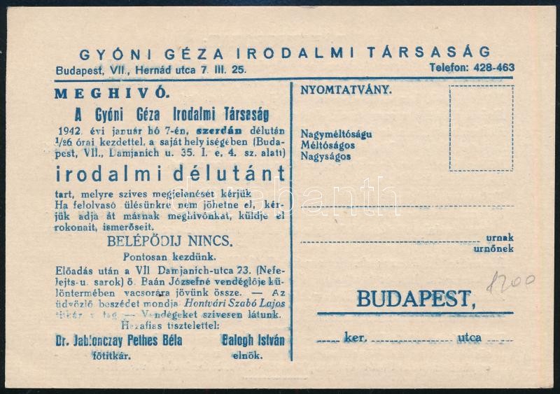 1942 A Gyóni Géza Irodalmi Társaság fejléces levelezőlapja irodalmi dé... https://www.darabanth.com/hu/419-Gyorsarveres/419.0/Mutargy-papirregiseg-egyeb/Nyomtatvanyok~1000002/1942-A-Gyoni-Geza-Irodalmi-Tarsasag-fejleces-levelezolapja-irodalmi-delutan-programjaval~II2652519
