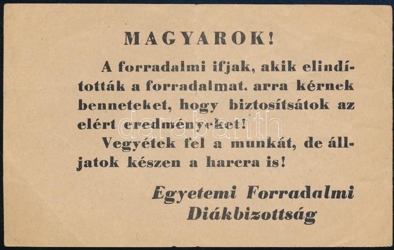 1956 "Magyarok!", az Egyetemi Forradalmi Diákbizottság röplapja, 15x9,... https://www.darabanth.com/hu/419-Gyorsarveres/419.0/Mutargy-papirregiseg-egyeb/Nyomtatvanyok~1000002/1956-Magyarok-az-Egyetemi-Forradalmi-Diakbizottsag-roplapja-15x9-5-cm~II2649318