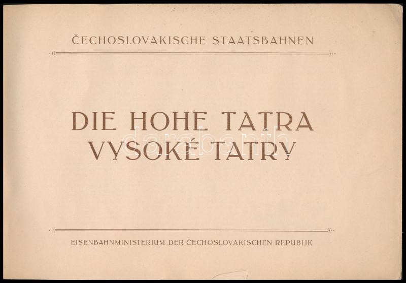 cca 1920 Die Hohe Tatra. Vysoké Tatry. Cechoslovakische Staatsbahnen / A Magas-Tátra, német nyelvű, képes album, fekete-fehér fotókkal, két színes térképpel és egy színes, kihajtható panorámaképpel. Zsinórfűzéses papírkötésben, sérült, kissé foltos borítóval.