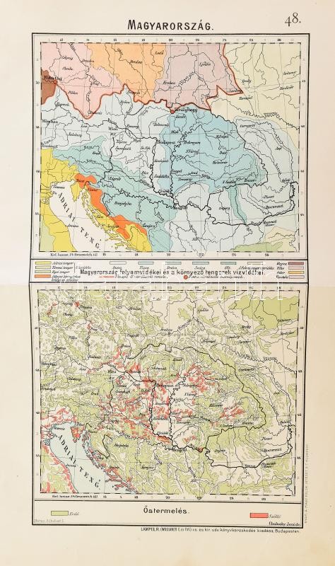 Leírás: Magyarország folyamvidékei és a környező tengerek vízvidékei + őstermelés térkép, 38,5×23,5 cm