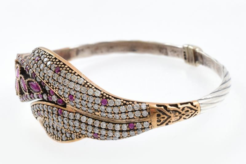 Leírás: Ezüst(Ag) karperec, kövekkel gazdagon kirakva, szintetikus rubinnal, jelzett, bruttó: 26 g