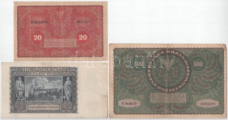 Lengyelország 1919. 20M + 500M + 1934. 100Zl (2x) + 1940. 10Zl (2x) + ... https://www.darabanth.com/hu/419-Gyorsarveres/419.0/Numizmatika/Kulfoldi-bankjegyek~2000014/Lengyelorszag-1919-20M-plus-500M-plus-1934-100Zl-2x-plus-1940-10Zl-2x-plus-20Zl-TIII-III-kozte-folt-~II2651004