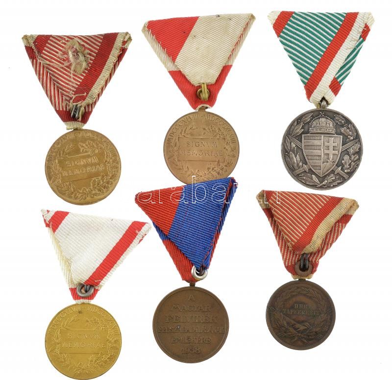 6db-os kitüntetés tétel, közte 1898. "Jubileumi Emlékérem Fegyveres Erő Számára / Signum memoriae (AVSTR)" Br kitüntetés nem hozzá illő mellszalaggal (2x) + "Jubileumi Emlékérem Polgári Állami Alkalmazottak Számára / Signum memoriae (AVST)" Br kitüntetés mellszalagon + 1914. "Ferenc József Bronz Vitézségi Érem (Der Tapferkeit)" Br kitüntetés mellszalagon + 1929. "Magyar Háborús emlékérem kardokkal, sisakkal" "Pro Deo et Patria (Az Istenért és a Hazáért) 1914-1918" ezüstözött, jelzett Br emlékérem mellszalagon + 1938. "Felvidéki Emlékérem, II. Rákóczi Ferenc" Br kitüntetés mellszalagon T:1-,2 ph, patina 6pcs of military decorations, in it Hungary 1898. "Commemorative Jubilee Medal for the Armed Forces" Br decoration with not original ribbon (2x) + "Commemorative Jubilee Medal for the Civil State Officials" Br decoration with ribbon + 1914. "Bronze Gallantry Medal (Der Tapferkeit)" Br decoration with original ribbon + 1929. "Hungarian Commemorative War Medal with swords and a helmet" "Pro Deo et Patria (For God and Homeland) 1914-1918" silver-plated, marked Br commemorative medallion with ribbon + 1938. "Upper Hungary Medal, Francis II Rákóczi" Br decoration with ribbon C:AU,XF edge error, patina NMK 249,250,137,418,427