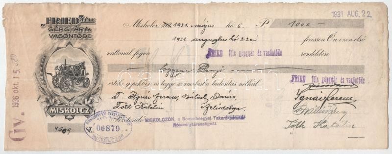 Leírás: Miskolc 1931. "Fried-féle Gépgyár és Vasöntöde Miskolcz" kitöltött váltója 1000P-ről, bélyegzésekkel, illetékbélyegekkel T:III