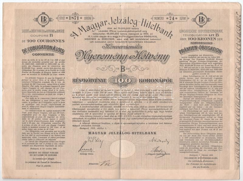 Leírás: Budapest 1906. "A Magyar Jelzálog-Hitelbank Konvenzionális Nyeremény-Kötvénye" "B" részkötvény 100K-ról, szárazpecséttel T:III