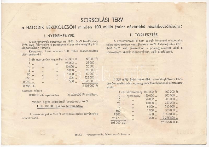 Leírás: Budapest 1955. "Hatodik Békekölcsön" nyereménykötvénye 100Ft értékben, szárazpecséttel T:III