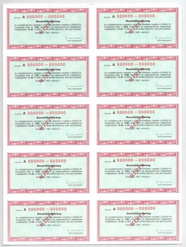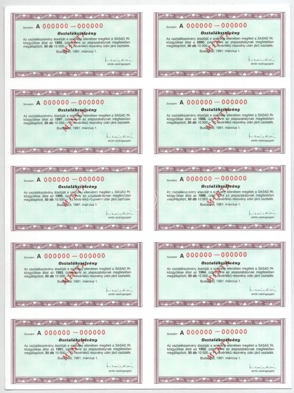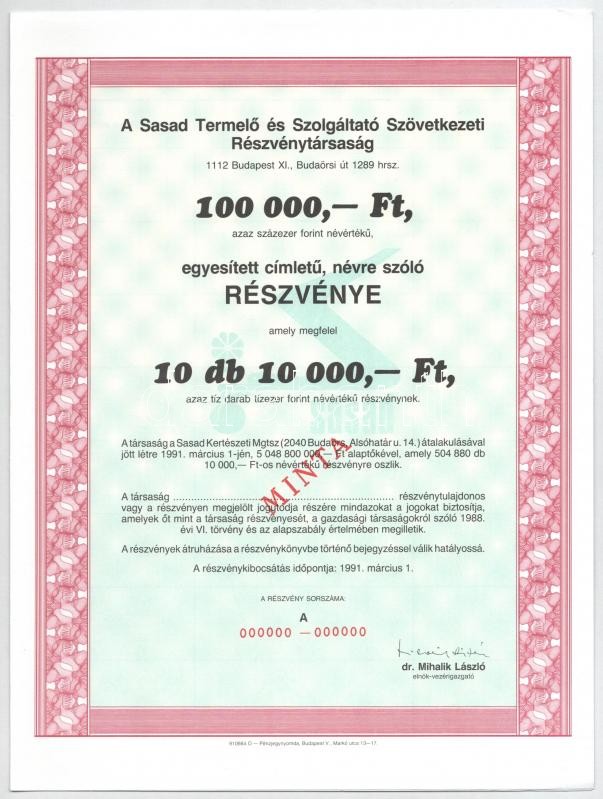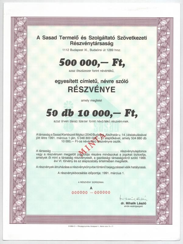 Budapest 1991. "Sasad Termelő és Szolgáltató Szövetkezeti Részvénytársaság" névre szóló részvényei (5x), mindegyik szelvényekkel és "MINTA" bélyegzéssel: 10.000Ft-ról, 50.000Ft-ról (2x), 100.000Ft-ról, 500.000Ft-ról T:I,I-