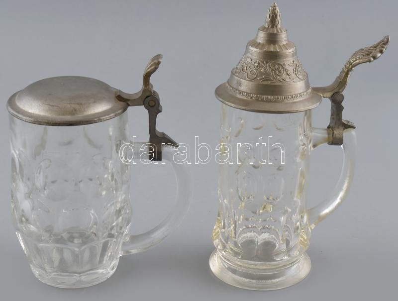 Leírás: 2db fémfedeles, üveg, sörös korsó, kopott, m: 17-21cm