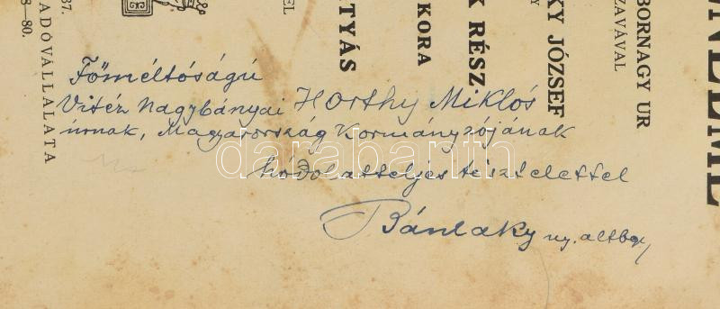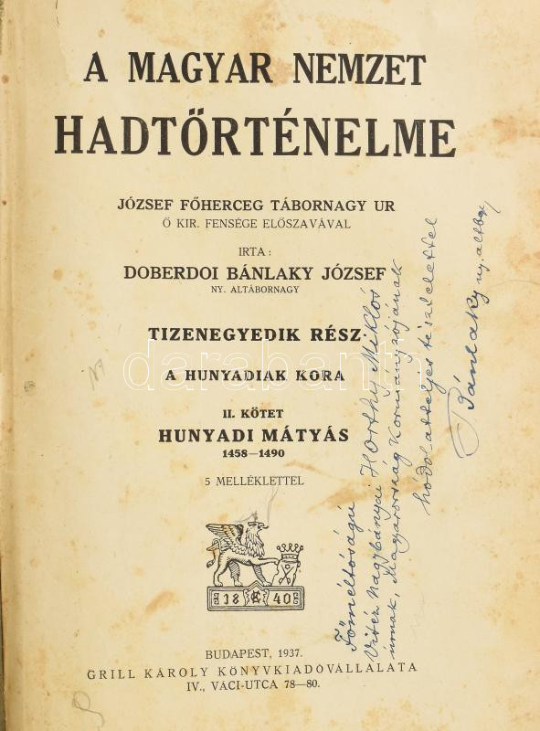 Doberdoi Bánlaky József: A magyar nemzet hadtörténelme. XI. rész: A Hunyadiak kora. II. kötet: Hunyadi Mátyás. 1458 - 1490. József főherceg tábornagy úr ő kir. fensége előszavával. Bp., 1937., Grill Károly, 1-278,281-282 p. Kiadói aranyozott egészvászon-kötés, kopott borítóval, sérült gerinccel, a címlap szakadt, a címlap hátoldala firkált, foltos lapokkal. A szerző, Doberdói Bánlaky József (1863-1945, Breit József) honvéd altábornagy, hadtörténész által DEDIKÁLT példány: "Főméltóságú vitéz nagybányai Horthy Miklós úrnak, Magyarország Kormányzójának hódolatteljes tiszetelettel: Bánlaky ny. altábornagy."