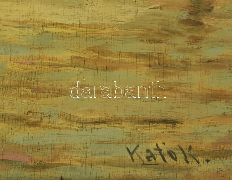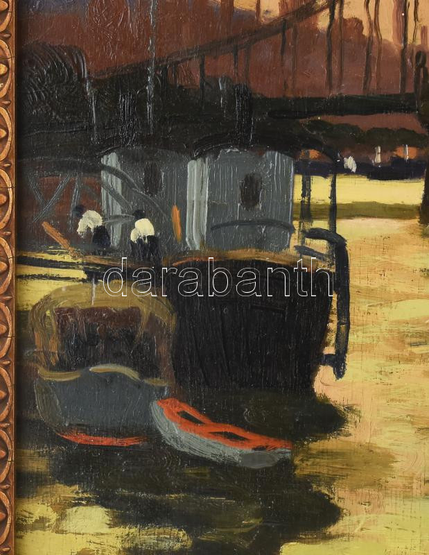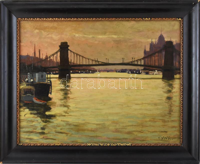 Kató Kálmán (1876-1946): Budapesti panoráma a Lánchíddal. Olaj, falemez, jelezve jobbra lent. Antik, korabeli, kissé sérült fakeretben, 50×67,5 cm / oil on wood, signed, framed