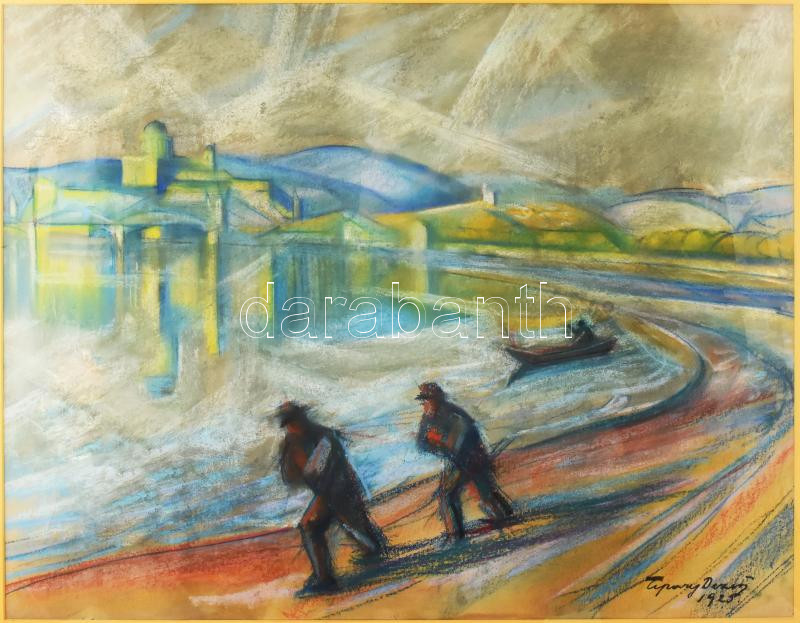 Tipary Dezső (1887-1967): Dunapart, háttérben Esztergom, 1925. Pasztell, karton, jelzett. Üvegezett fakeretben. 46,5x59,5 cm / Dezső Tipary (1887-1967): Banks of the Danube, with Esztergom in the background. Pastell on paper, signed. Framed, 46,5x59,5 cm