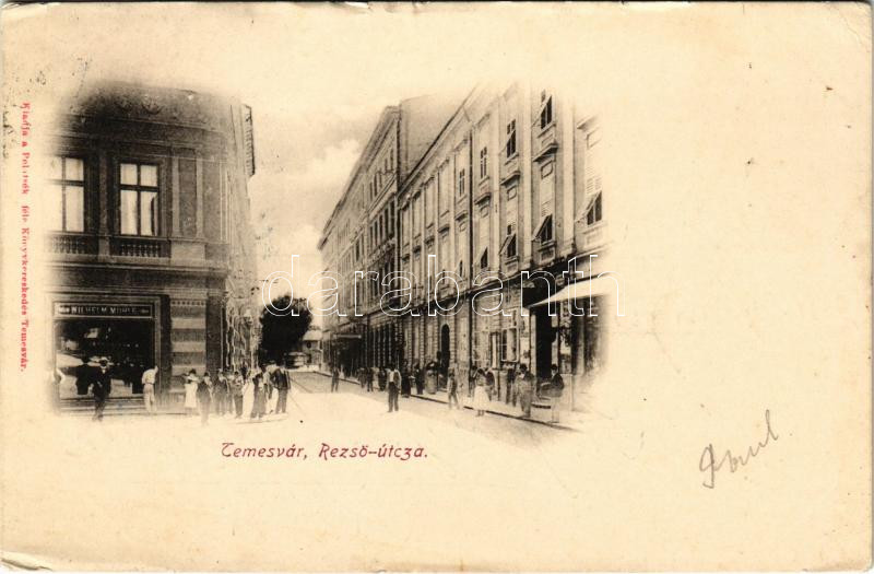 1901 Temesvár, Timisoara; Rezső utca, Wilhelm Mühle üzlete, villamos. ... https://www.darabanth.com/hu/42-Nagyaukcio/42.1/Kepeslapok/Erdely~17445/1901-Temesvar-Timisoara-Rezso-utca-Wilhelm-Muhle-uzlete-villamos-Polatsek-kiadasa-street~II3122338