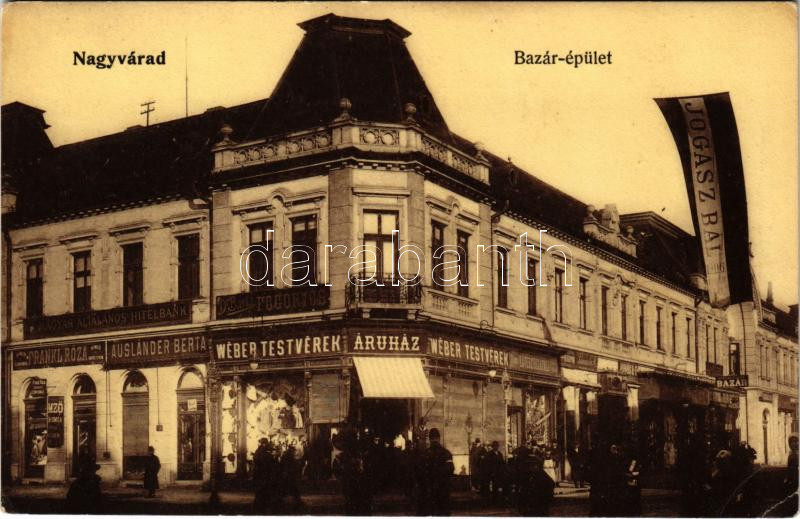 Leírás: 1908 Nagyvárad, Oradea; Bazár épület, Magyar Általános Hitelbank nagyváradi fiókja, Dr. Barta fogorvos, Frankl Róza, Ausländer Berta, Wéber Testvérek üzlete, "Jogász bál 1906". Rákos Vilmos kiadása / street view, shops, bank (EB)