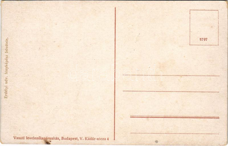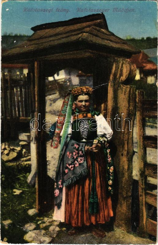 Leírás: Kalotaszeg, Tara Calatei; Kalotaszegi leány, erdélyi népviselet, folklór. Vasúti levelezőlapárusítás. Erdélyi udvari fényképész felvétele / Kalotaszeger Mädchen / Transylvanian folklore (EK)