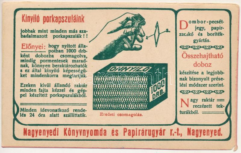Nagyenyed, Aiud; Könyvnyomda és Papírárugyár R.T. reklámlapja. Magyarország legnagyobb, villamos üzemre berendezett és a külfölddel szemben úgy ár, mint minőség tekintetében legversenyképesebb lithográfiai, könyvnyomdai és dombornyomó intézete, gyógyszerészi és kereskedelmi dobozárugyára / book printing house and paper factory advertisement card. litho (non PC) (EM)