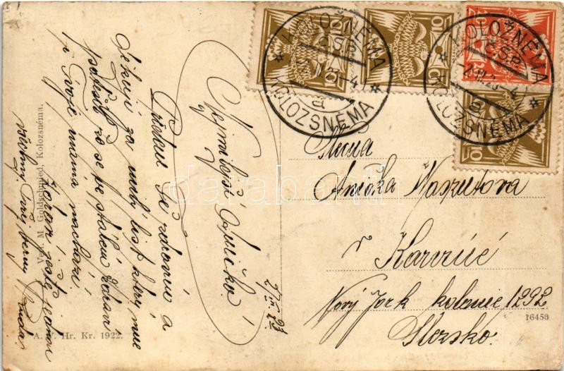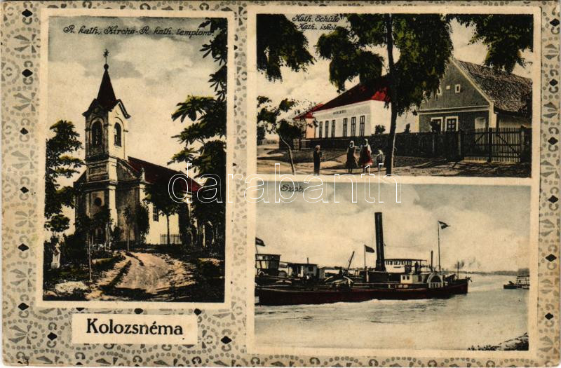 Kolozsnéma, Klízska Nemá; Római katolikus templom és iskola, "SZOB" oldalkerekes vontató gőzhajó. M. Goldschmied kiadása / church and school, steam tug. Art Nouveau (EK)