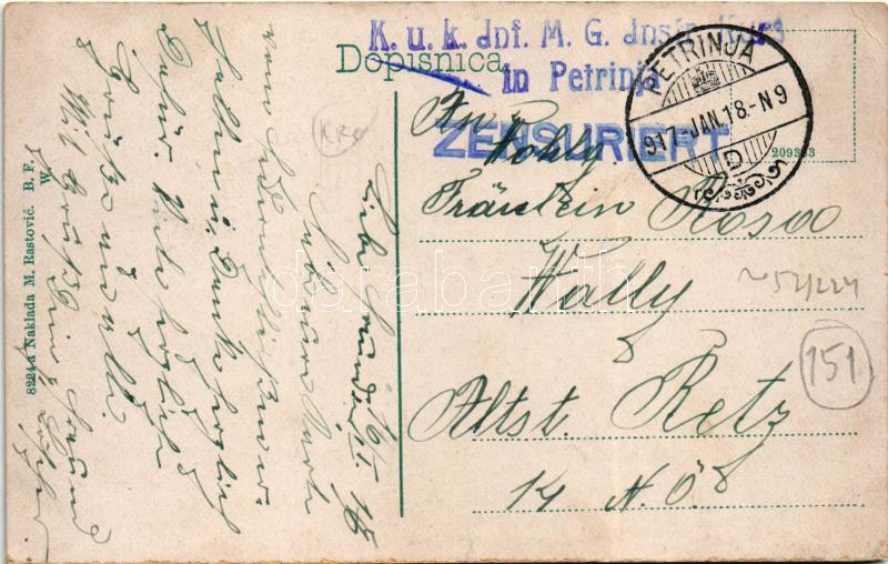 Leírás: 1917 Petrinya, Petrinja; Duga ulica / street (EK) + "K.u.k. Inf. M.G. Instr. Kurs. in Petrinja Zensuriert"