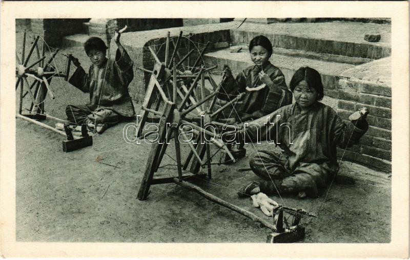 Xianxian, Sienhsien, Sien-Hsien; Chinesische Mission von Sien-Hsien. Waisenmädchen beim Spinnen von Rohseide / Chinese mission, orphan girls spinning raw silk