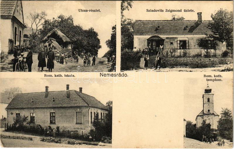 Leírás: 1936 Nemesrádó (Zala), utca, Római katolikus templom és iskola, Szladovits Zsigmond üzlete (EK)