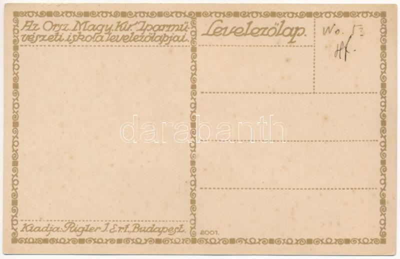Leírás: Az Orsz. Magy. Kir. Iparművészeti iskola levelezőlapjai. Ungarische Werkstätte No. 2001. Kiadja Rigler József Ede Rt. / Hungarian art postcard (fl)