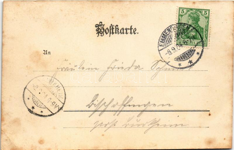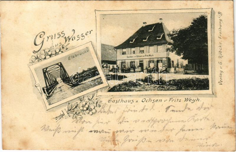 Leírás: 1904 Emmendingen, Gruss aus Wasser. Elzbrücke, Gasthaus z. Ochsen v. Fritz Weyh / bridge, inn. Art Nouveau, floral (EB)