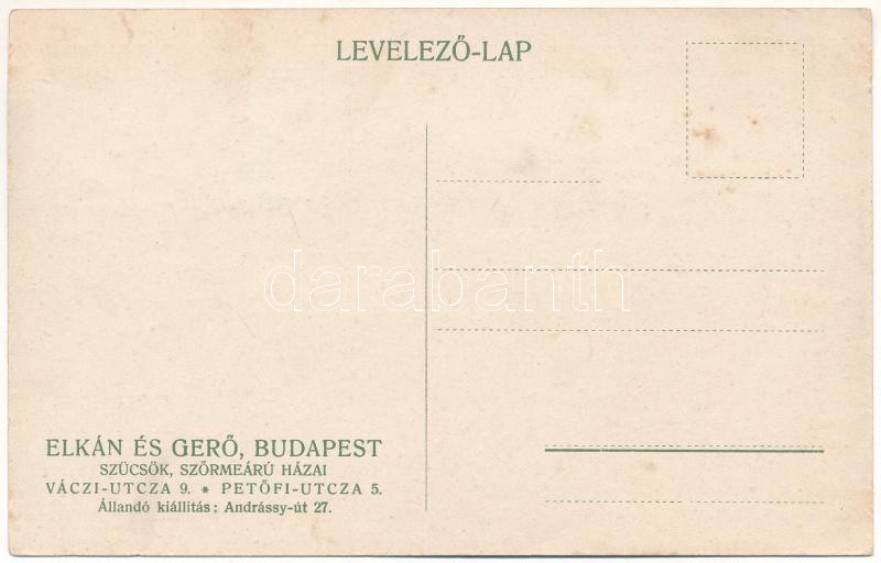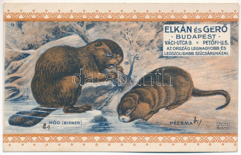 Hód, pézsmapocok. Elkán és Gerő szűcsök szőrmeáru és sapkagyár üzletének reklámja. Budapest V. Váci utca 9. és Petőfi utca 5. Grafikai Intézet R.T. / Beaver, muskrat. Hungarian furriers' advertisement card (kis szakadás / small tear)