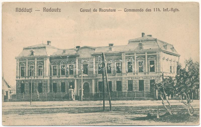 Leírás: 1923 Radauti, Radóc, Radautz (Bukovina, Bucovina, Bukowina); Cercul de Recrutare, Commando des 114. Inf.-Rgts. / Romanian military, infantry regiment headquarters (EK)