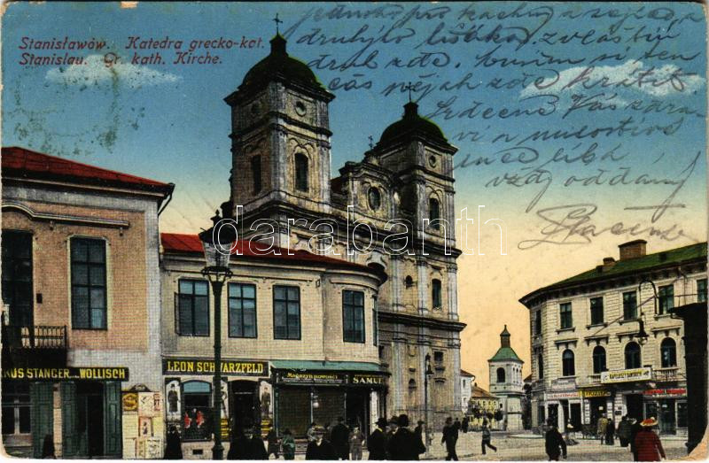 1915 Ivano-Frankivsk, Stanislawów, Stanislau; Katedra grecko-kot. / Greek Catholic church, shops of Markus Stanger und Wollisch, Leon Schwarzfeld, Magazyn nowosci (EK)