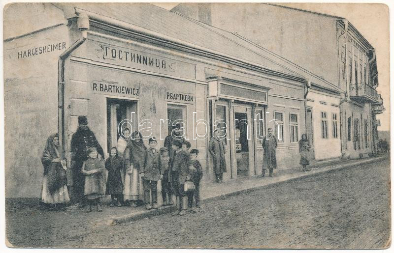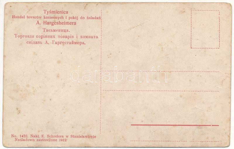 Tysmenytsia, Tysmenitsia, Tysmienica; Handel towarów korzennych i pokój do sniadan A. Hargesheimera / street view, shop of Hargesheimer and R. Bartkiewicz (worn corners)