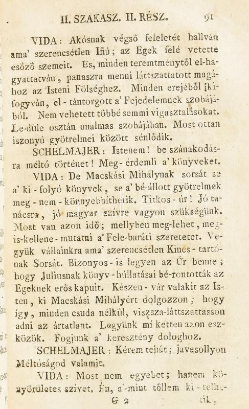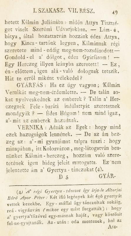 Dugonics András: Az arany pereczek. Szomorú történet öt szakaszokban. Első kiadás. Dugonics András: Az arany pereczek. Szomorú történet öt szakaszokban. Első kiadás. Posonyban és Pesten, 1790, Füskúti Landerer Miály(!). 1t. címképen a főhősnő, Macskási Julianna egészalakos képe látható (Binder János Fülöp rézmetszete. HIÁNYZIK!)), 453p. A könyv első három, valamint utolsó két levele másolatban pótolva. A mű az Etelka sikerén felbuzdulva szélesebb tömegek számára készült. ,,Minden szavak tulajdon értelmekben vannak", nincs tehát politikai célzata a műnek. Az előszóban Dugonics kifejti, hogy a magyar történelemből vett témával a nemzeti érzés és büszkeség felébresztését kívánja előmozdítani. A Barcsay Ákos erdélyi fejedelem korában játszódó kalandos történet a szülők és a gyermekek kölcsönös szeretetét mutatja be. A mű esztétikai szempontokból, cselekményvezetésének egyenletességét, szövegformálásának gördülékenységét tekintve áll a többi Dugonics-regény fölött. A szerző életében két kiadást ért meg ez a mű. Korabeli bőrkötésben. Ritka.