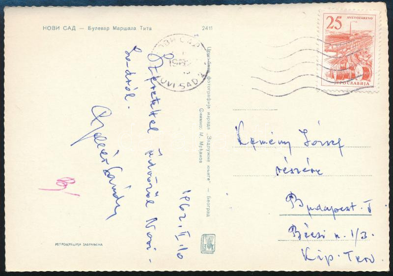 1962 Gellér Sándor (1925-1996) válogatott magyar labdarúgó, az Aranycsapat cserekapusa autográf sorai és aláírása Újvidékről küldött képeslapon / autograph signature by famous Hungarian football goalkeeper Gellér Sándor (1925-1996), member of the Golden Team (Mighty Magyars) on postcard sent from Novi Sad