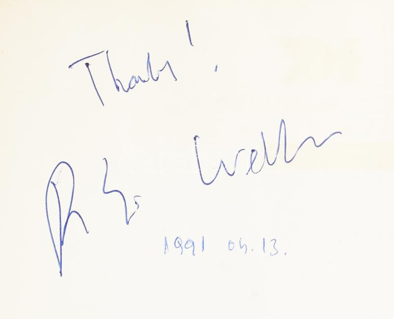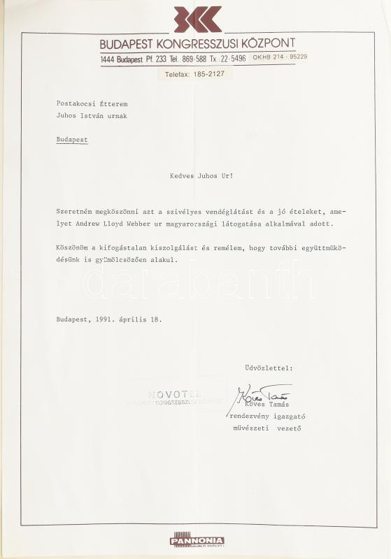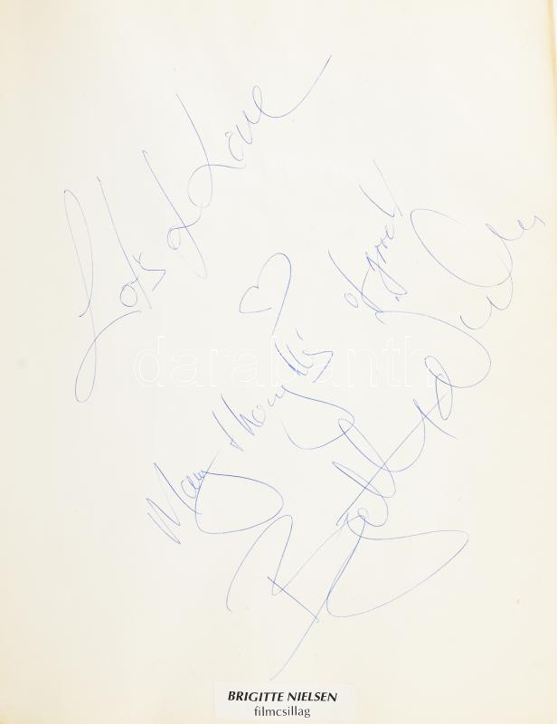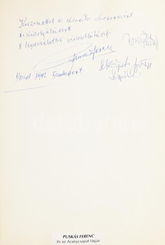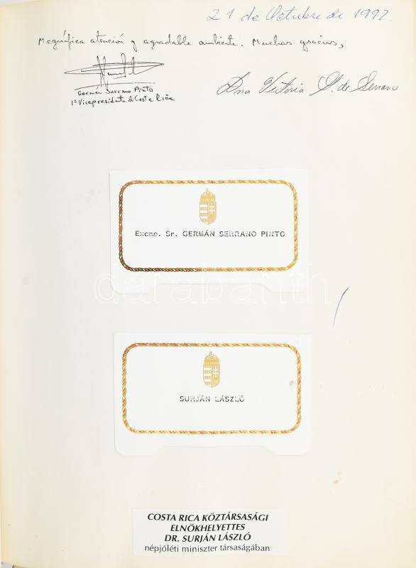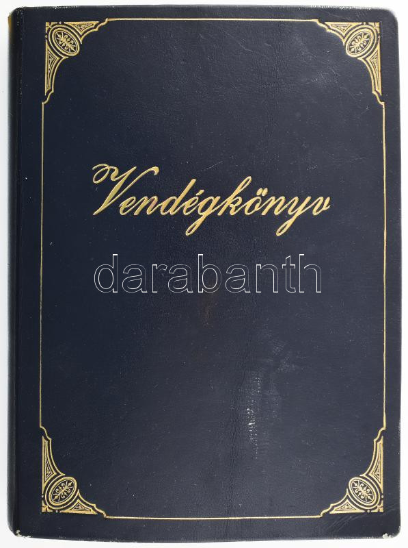 cca 1989-2004 Postakocsi Étterem (Óbuda, Fő tér 2.) vendégkönyve, az étteremben megfordult híres személyek aláírásaival, bejegyzéseivel. Főként katonatisztek, politikusok, de kisebb részben színészek, sportolók is. Darnyi Tamás (1967- ) négyszeres olimpiai bajnok úszó; Puskás Ferenc (1927-2006) labdarúgó, az Aranycsapat tagja; Andrew Lloyd Webber (1948- ) színházi (musical) zeneszerző; XVI. Károly Gusztáv svéd király és Szilvia svéd királyné; Henry Alfred Kissinger (1923-2023) amerikai diplomata, politikus, külügyminiszter; Brigitte Nielsen (1963- ) dán színésznő; számos további, külföldi és magyar politikus, katonatiszt, stb. + beragasztott menük, névjegykártyák, újságcikkek. Aranyozott egészbőr-kötésben, 32x24x5 cm. / Hungarian restaurant's guestbook, with autograph signatures and entries by many famous guests (politicians, military officers, etc.), incl. Ferenc Puskás Hungarian football player; Andrew Lloyd Webber English composer; Henry A. Kissinger American diplomat, Secretary of State; Carl XVI Gustaf, King of Sweden and Queen Silvia; Brigitte Nielsen Danish actress and many others