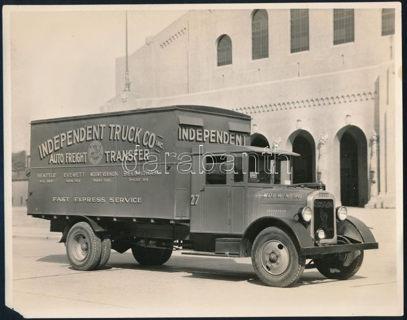 cca 1930 Seattle, Independent Truck költöztető teherautó nagy méretű fotója sarok hiánnyal 26x20 cm / Fageol Moving company large truck photo with corner missing 26x20 cm