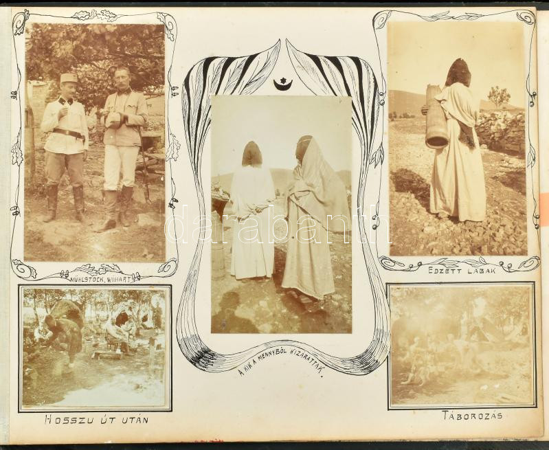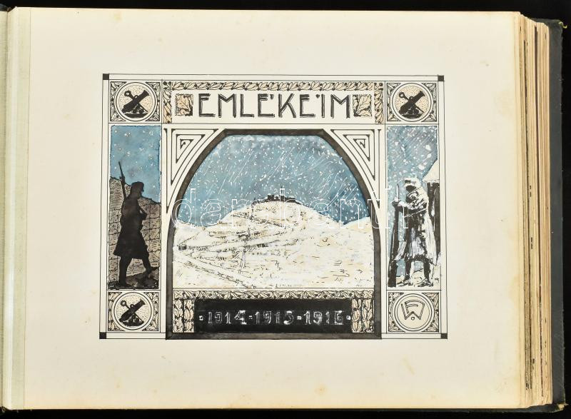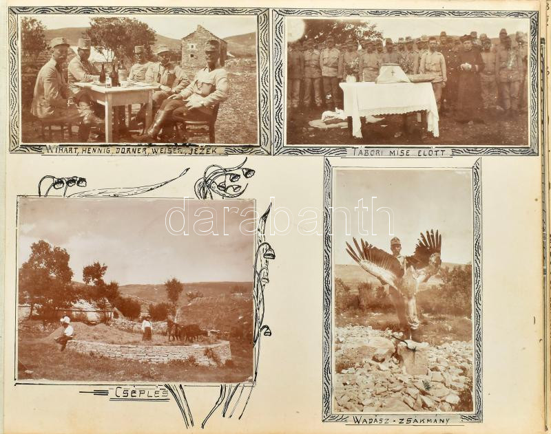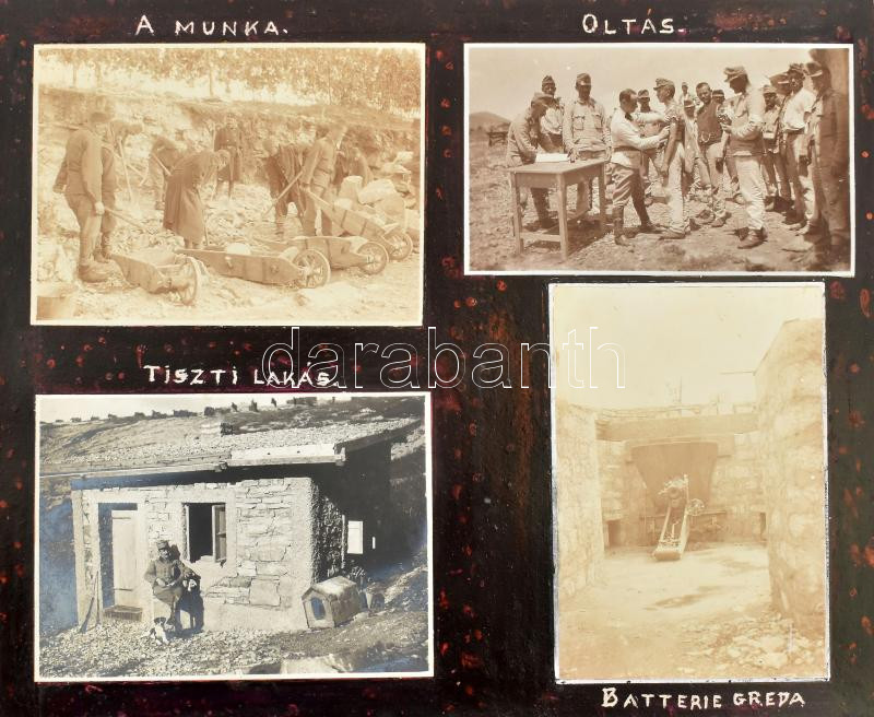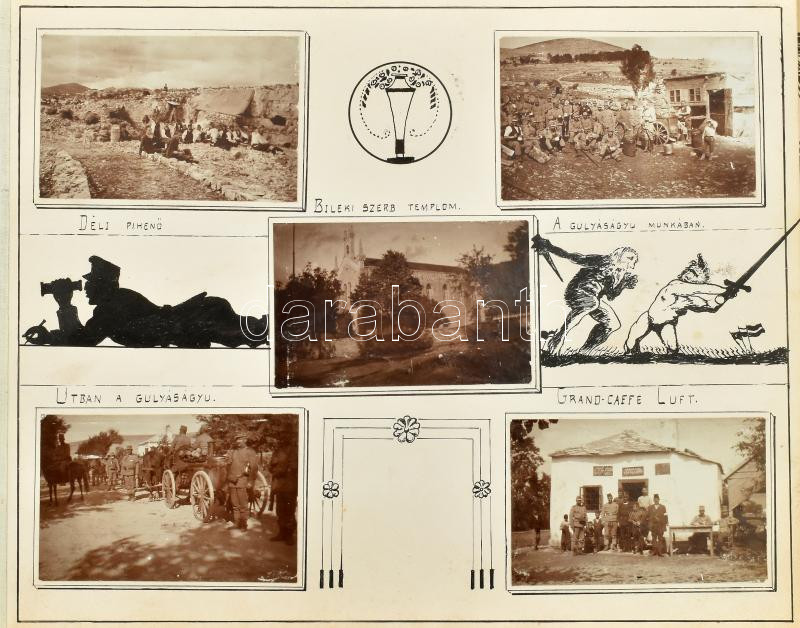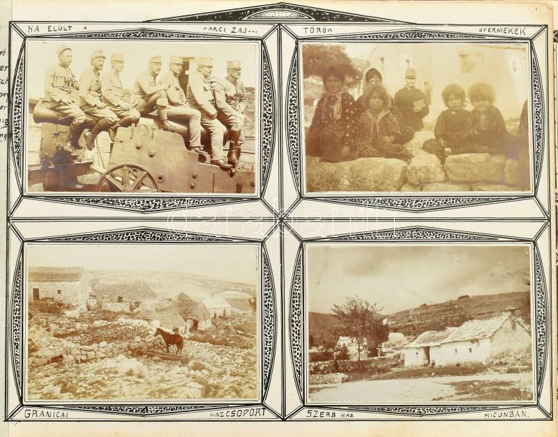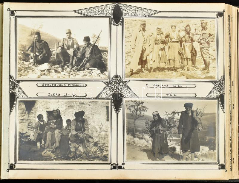 1914-1916 Katonai fotóalbum, beragasztott, feliratozott fotókkal, katonai és helyi érdekességek, emberek, falurészlet, tájrészlet, stb., Bilek, Ragusa, Trklia, Trebincica, Granica, tiszti lakás, katonai oltás, erőd homlokzata, gulyáságyú munkában, figyelő állomás, behavazott védmű, bileki szerb templom, wojnovici védmű, akadályöv télen, gyülekezés, "Autokolonne", mozsárüteg, stb., 171 db fotóval