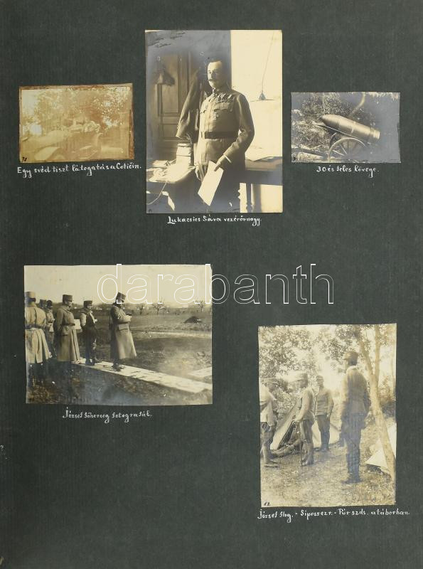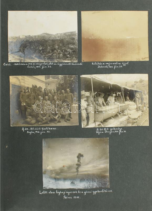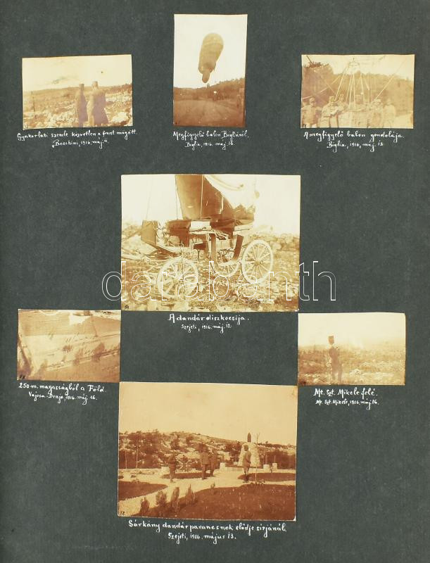 1915-1916 I. világháborús fotóalbum, olasz front (Görz/Gorizia, Doberdó, Rubia, Biglia, stb.), érdekes képekkel: lövészárok belülről, 30 és feles mozsár, József főherceg és a trónörökös (később IV. Károly) katonákat tüntetnek ki, megfigyelő ballon, stb. Összesen kb. 80-85 db beragasztott fotóval, változó méretben. Korabeli zsinórfűzéses, a borítón népi motívumokkal díszített albumban.