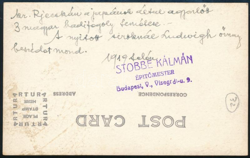 1919 Pervaja Recska, Pervaja Rjecska, Perwaja- Rjetschka (Vladivostok); a japánok által agyonlőtt három magyar hadifogoly temetése a japán-orosz hadifogoly táborban. Fotólap Hátoldalán Stobbe Kálmán (1883-1936) építőmester, labdarúgó, a magyar válogatott edzője pecsétjével / WWI funerel of three Hungarian POW-s shot by the Japanese in the Japanese-Russian POW (prisoner of war) camp. photo